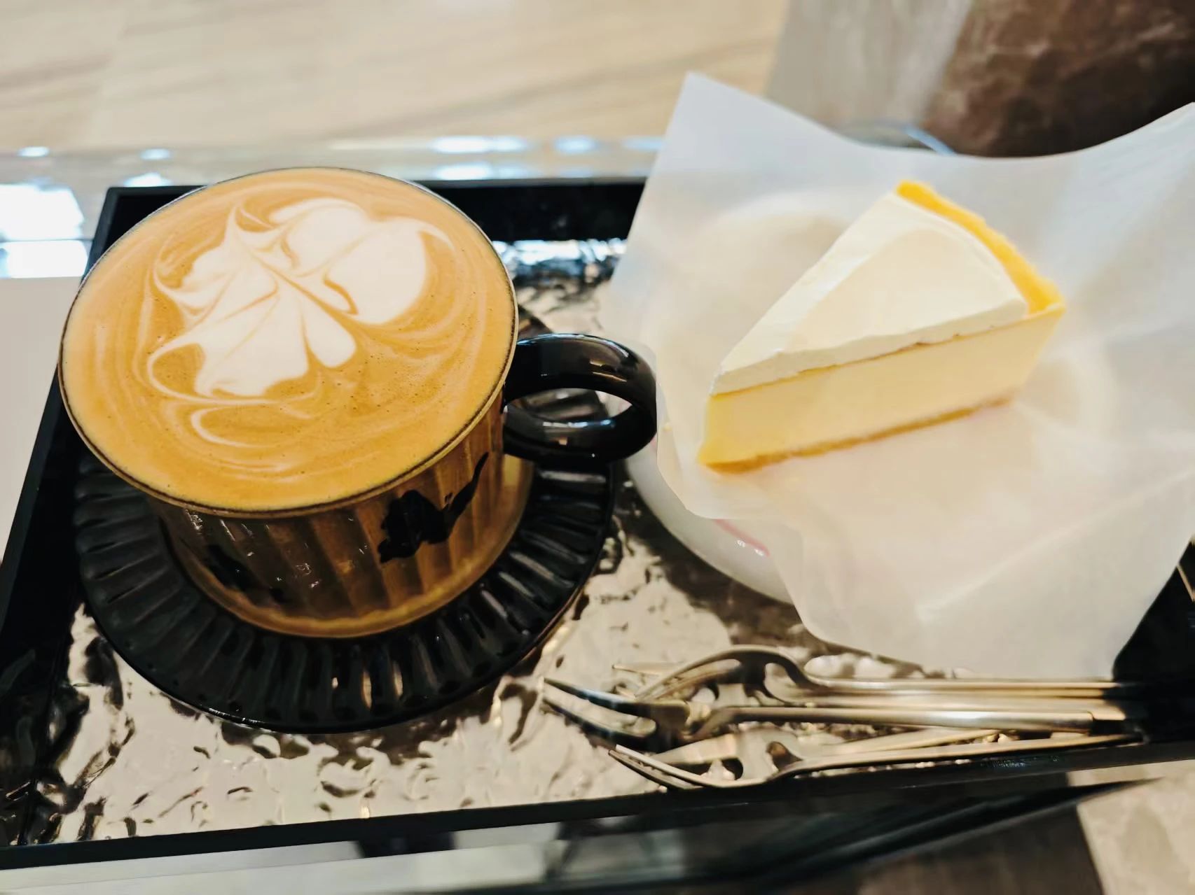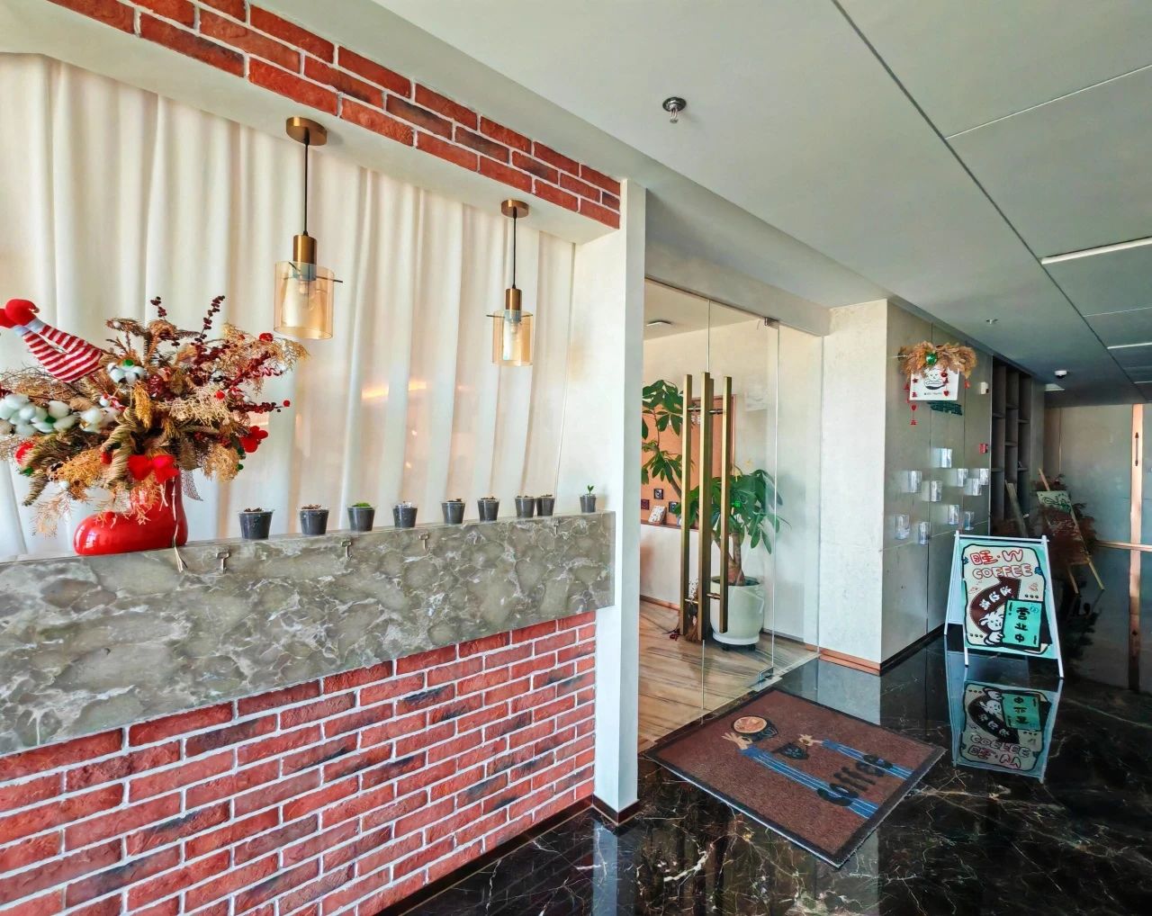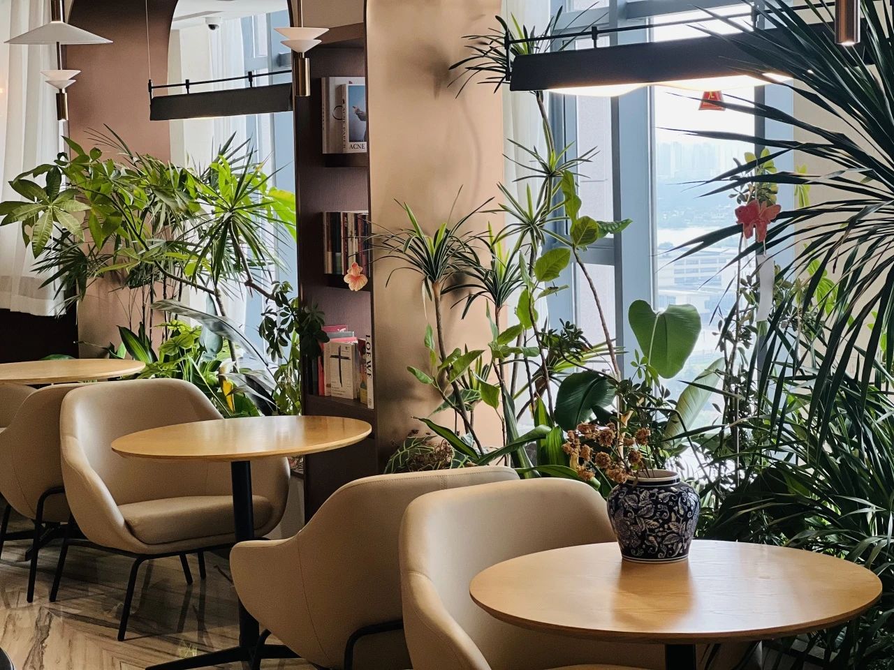 明亮的落地窗將城市的喧囂演繹成流動的背景,室內柔和的燈光、舒適的坐位、點綴的綠植,營造出松弛而溫暖的氛圍。