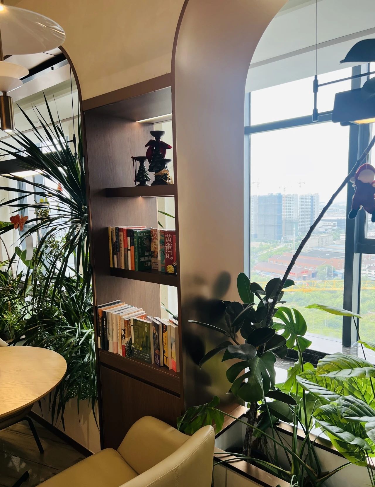 舒適的閱讀椅、小茶幾與點綴其間的綠植,散落在咖啡座旁、書架下、窗邊。