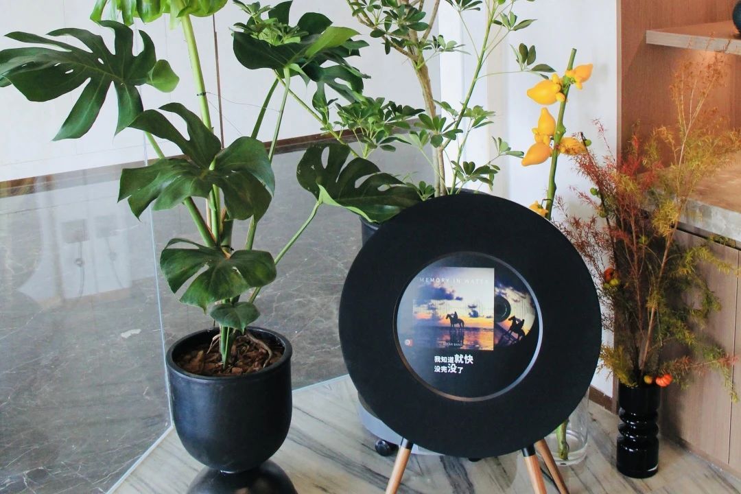 墻的另一側便是名為“時光旋律”的大型CD造型互動墻面。多個CD元素經過藝術化組合排列,形成富有節奏感的視覺樂章,呼應著“夏日白噪音”與專屬BGM《躍夏》主題。