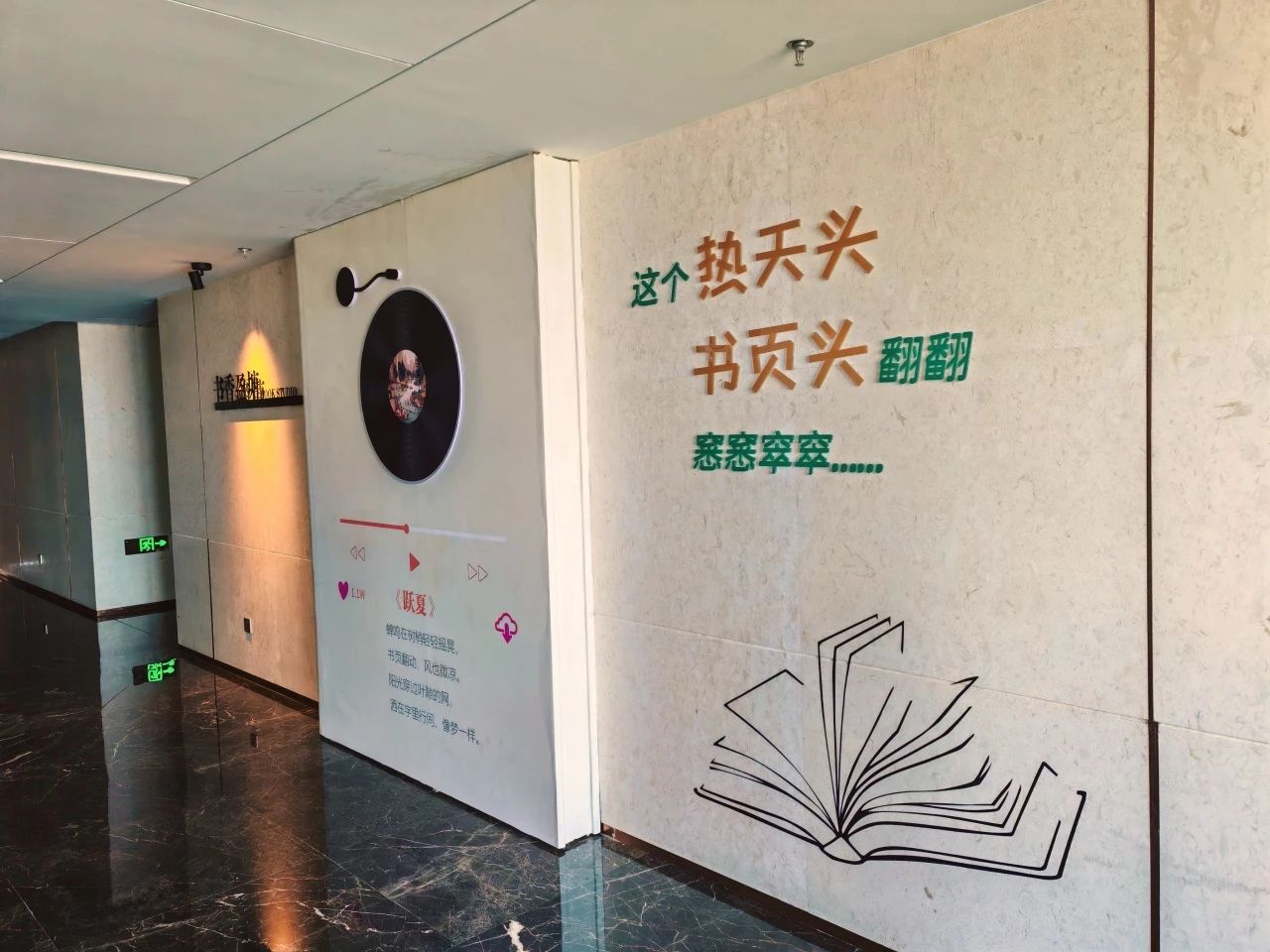 墻面無錫方言水晶字“這個熱天頭,書頁頭翻翻,窸窸窣窣”生動詮釋閱讀如夏日樹蔭般清涼寧靜的意境。