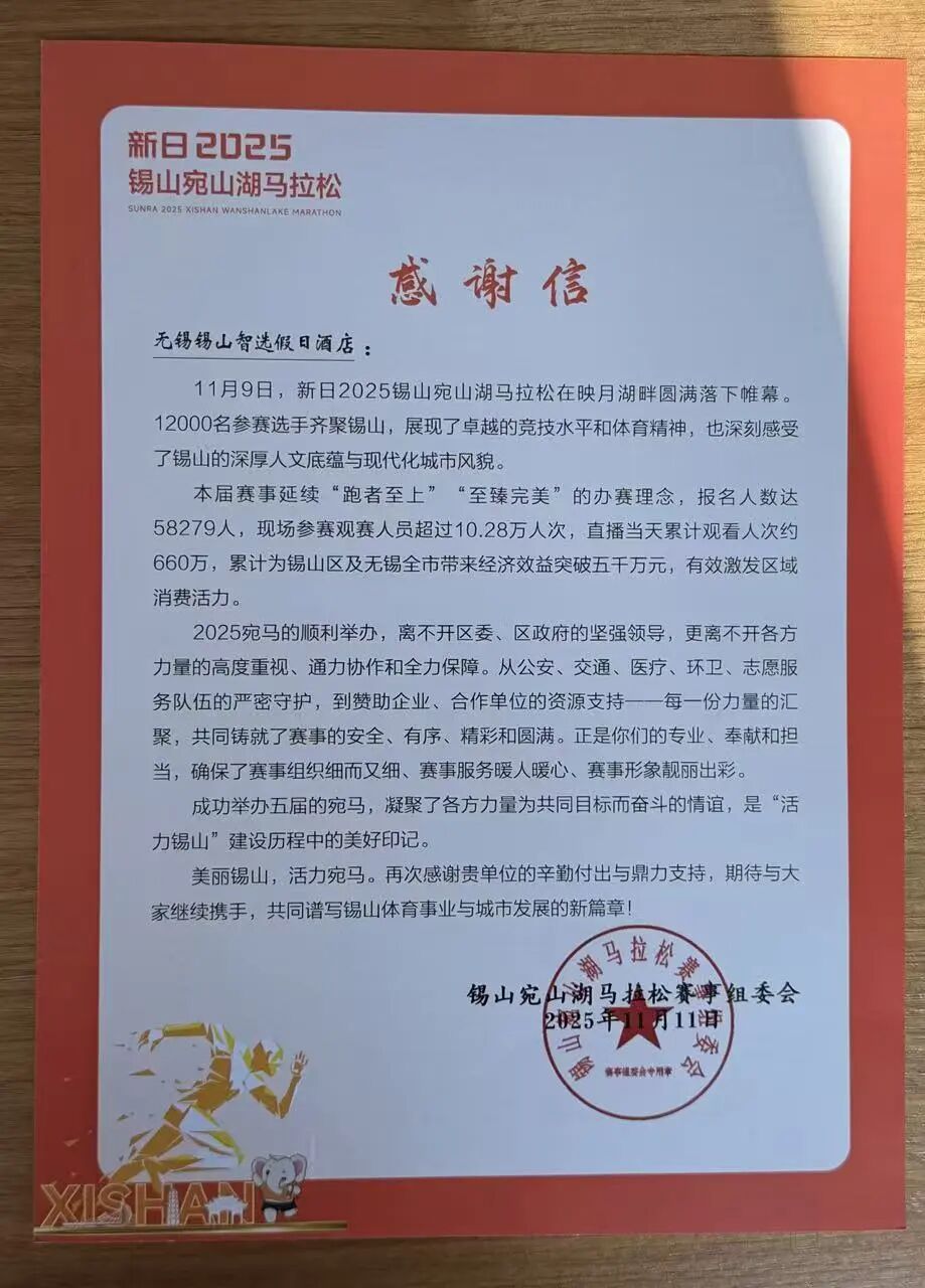 衷心感謝錫山宛山湖馬拉松組委會的信任與肯定,無錫錫山智選假日酒店將繼續秉持服務熱忱,與大家攜手同行,共同助力無錫體育事業與城市發展邁向更美好的明天!